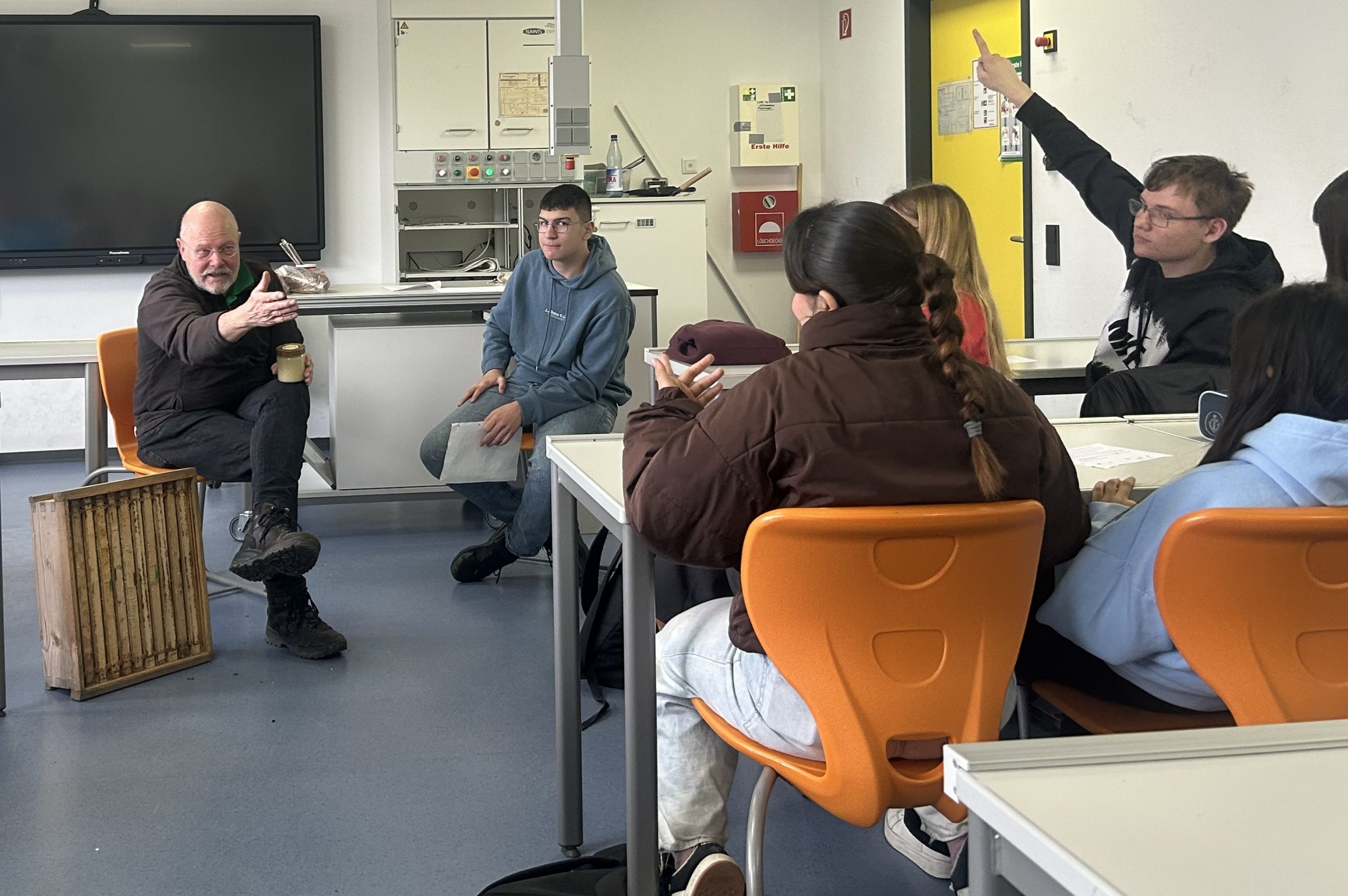 Der Bienenflüsterer aus Wetzlar ging dabei sehr gezielt und differenziert auf die unterschiedlichen Fragen sowie auf das bereits vorhandene Vorwissen der Schülerinnen und Schüler ein. Er schaffte es par excellence, komplexe Inhalte anschaulich und altersgerecht zu erklären und die Beiträge der Schülerinnen und Schüler wertzuschätzen und aufzugreifen.