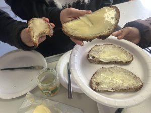 Darüber hinaus brachte er Anschauungsmaterial aus seiner Imkerei mit, darunter ein Imkerrähmchen mit ausgebauter Bienenwabe, das die Schülerinnen und Schüler aus nächster Nähe genauestens betrachten konnten. Dabei erklärte er praxisnah den Aufbau eines Bienenstocks sowie die Honiggewinnung. Ein besonderes Highlight war die anschließende Verkostung seines selbst produzierten Honigs mit Roggenbrot.