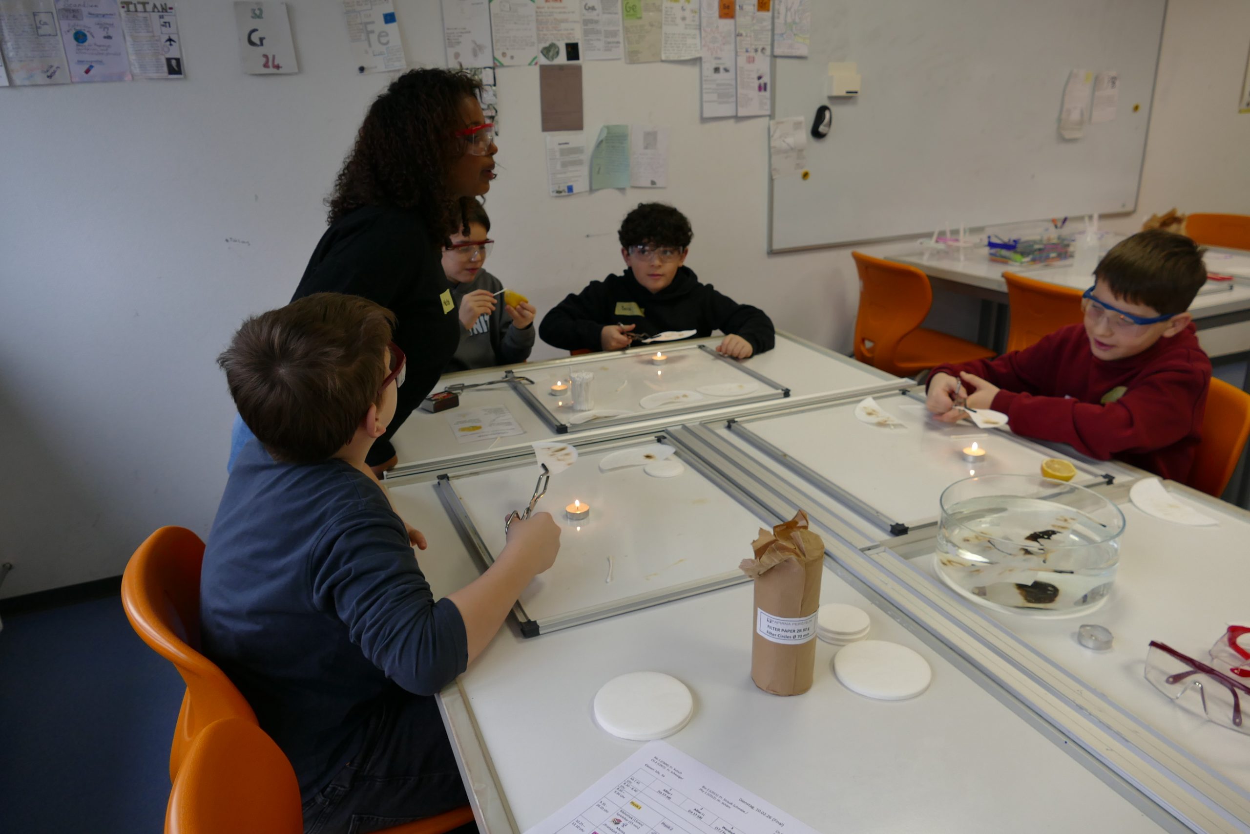 „Jetzt musst du den Objektivträger nehmen und ins Okular schauen.“ „Nun ist der Stromkreis geschlossen.“ „Dazu brauchst du zwei Reagenzgläser.“ – Diese und andere Anweisungen konnte man hören, wenn man in den vergangenen Unterrichtstagen durch den Trakt der naturwissenschaftlichen Räumlichkeiten der Johannes-Gutenberg-Schule gegangen ist. Unter dem Motto des experimentellen Lernens waren etwa 200 Schülerinnen und Schüler aus den benachbarten Grundschulen von Ehringshausen, Aßlar, Sinn, Katzenfurt, Werdorf, Ulmtal und Beilstein in der weiterführenden IGS zu Gast, um sich in den Fächern Biologie, Physik und Chemie von älteren JGS’lern anleiten zu lassen. Schnell hatten sich die Grundschülerinnen und Grundschüler auf Anleitung der „Großen“ weiße Versuchskittel angezogen, Schutzbrillen aufgesetzt und alle weiteren Sicherheitsmaßnahmen befolgt, bevor es zu den exakten Versuchsaufbauten ging. Da wurde ein Stromkreislauf geschlossen, die Kraft von Magneten getestet, kleine Tiere und Pflanzen unter dem Mikroskop betrachtet sowie unterschiedliche Stromkreise mit Lampen und Schaltern aufgebaut. Auch der Versuchsaufbau zum Hebelgesetz faszinierte die kleinen Gäste, als jeder erleben konnte, wie ein längerer Hebelarm ganz wenig Kraft benötigt, um doch sehr leicht ein größeres Gewicht bewegen zu können. Die staunenden Gesichter waren ein Beleg dafür, dass die Schülerinnen und Schüler aus den Abschlussklassen ihr Wissen sehr gut vermitteln konnten und die Spannung immer hochhielten. Die so genannten Lernpaten standen den Gästen aus den Grundschulen den gesamten Unterrichtstag zur Verfügung und schnell war klar, dass alle beim gemeinsamen Lernen ihre große Freude hatten.