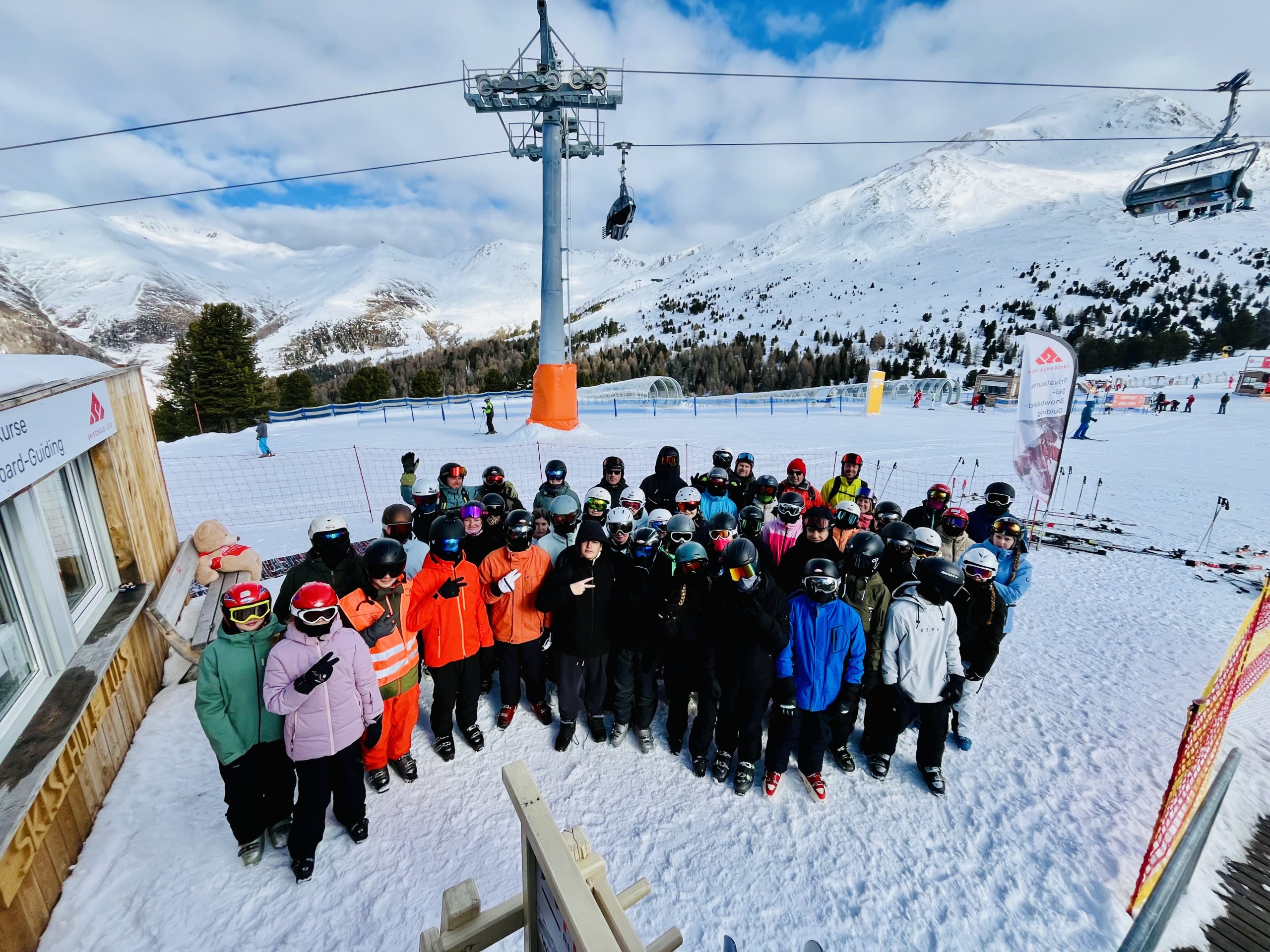 Beste Schneeverhältnisse, strahlender Sonnenschein und eine tolle Stimmung – so begann die diesjährige Schul-Skifreizeit für 44 Schülerinnen und Schüler der Johannes-Gutenberg-Schule in Tirol. Schon bei der Ankunft in den Alpen war die Vorfreude groß, denn eine Woche lang tauschten die Kursteilnehmer das Klassenzimmer gegen die Skipiste. Zusammen mit ihren Lehrkräften Bastian Bretfeld, Michael Guht, Dominik Stauber, Jochen Tessmer und Lehramtsstudentin Louisa Bothe wurde eine Woche lang im 600 Kilometer entfernten Skigebiet von Nauders gewedelt und wurden Schwünge geübt. Nach dem Beziehen der Hotelzimmer in Pfunds konnten sich die Schülerinnen und Schüler im Schwimmbad noch ein wenig entspannen, bevor es dann am nächsten Morgen direkt nach dem Frühstück hinauf nach Nauders ins Skigebiet ging. Während die 21 Anfängerinnen und Anfänger das Skilaufen in Kleingruppen von ihren erfahrenden Lehrkräften am Förderband und Tellerlift im Tal schnell erlernten und am Ende der Woche souverän die leicht befahrbaren Pisten bewältigten, konnten sich die restlichen Schülerinnen und Schüler schon mit der Gondel auf einen 2000er begeben. Die Könner erkundeten das Skigebiet von oben bis unten und nutzten jeden Pistenkilometer Zentimeter für Zentimeter aus, wobei sie auch vor den anspruchsvollsten Pisten keinen Halt machten. Und wer es mit den Pistenregeln nicht so genau nahm, bekam eine wunderbar gestaltete Warnweste als Kennzeichen für die „Pistensau“ des Tages verliehen.