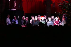 Mit den Beiträgen „Weihnachtszeit“ und „Sternenhimmel“ begeisterte die Klasse 5h sodann das Publikum und für einen weiteren musikalischen Höhepunkt sorgten die Klassen 8b und 8c, die unter der Leitung von Christian Weiher den Bangles-Klassiker „Eternal Flame“ eindrucksvoll darboten und damit einen echten Ohrwurm auf die Bühne brachten.